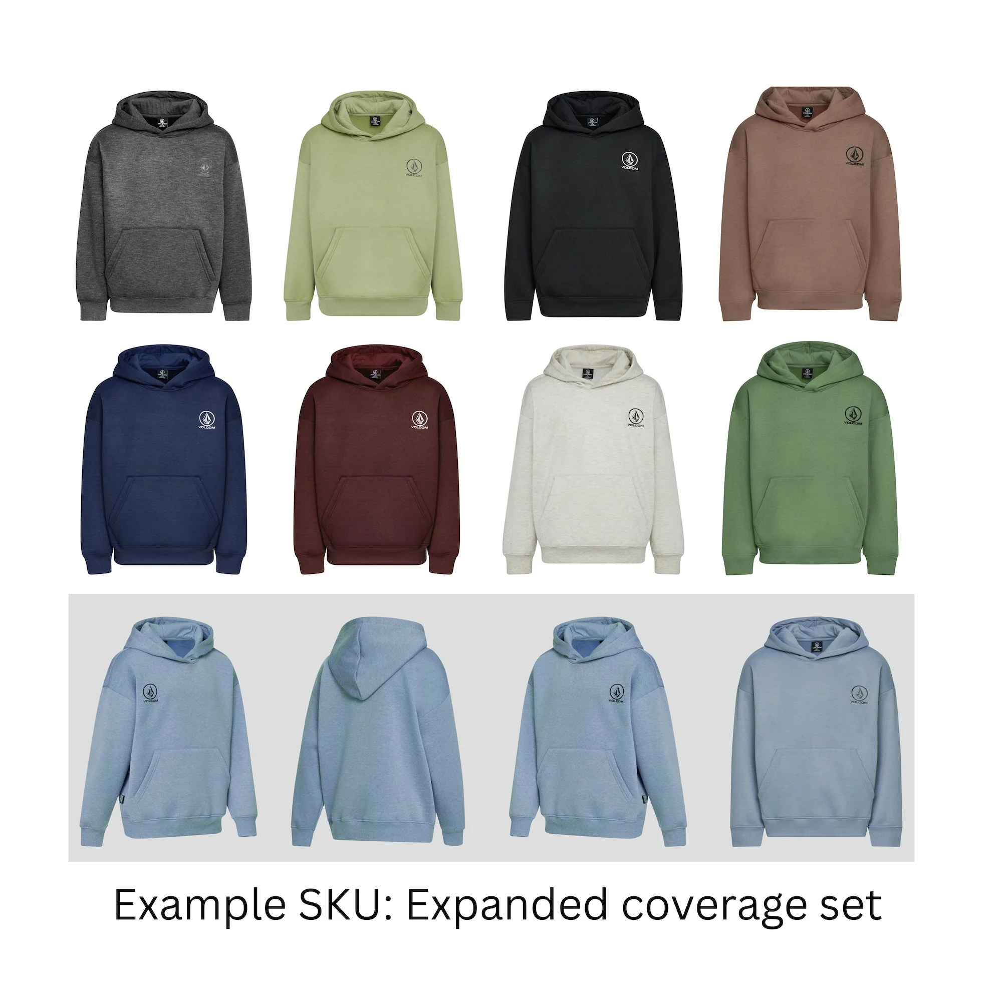 Structured apparel imaging for dimensional product representation across large SKU sets. Multiple sizes supported.